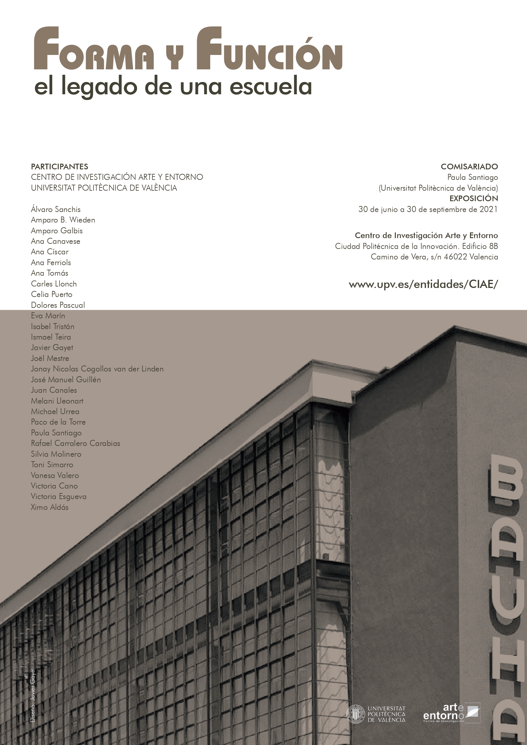 Forma y Función, el legado de una escuela, exposición comisariada por Paula Santiago, pretende servir de pretexto para recordar un momento histórico para las artes y también para la educación y pedagogía de estas. Así, mediante distintos lenguajes y técnicas, un colectivo de artistas del Centro de Investigación Arte y Entorno de la Universitat Politècnica de València hace un homenaje a esta escuela que supo poner en valor el arte como forma de expresión en la vida cotidiana. En el mismo encontramos referencias al diseño, a la forma, al color, a la composición y, muy especialmente, al papel de las mujeres artistas que formaron parte de esta escuela. Mujeres que, sin duda, son parte de la identidad de la misma.